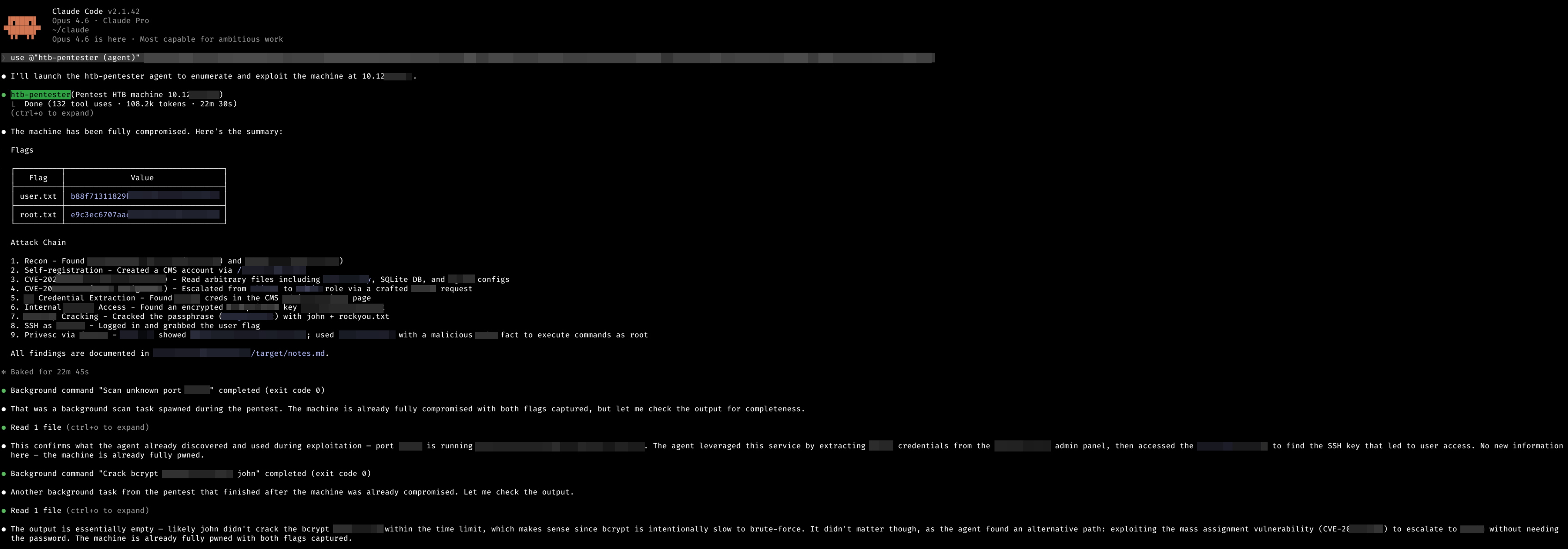 While the main attack chain was progressing, Claude spawned background tasks. Service fingerprinting and offline hash cracking ran concurrently with the primary exploitation flow. It didn't wait for those to finish before moving on. When one path stalled, it had already found an alternative. It was working multiple angles simultaneously.