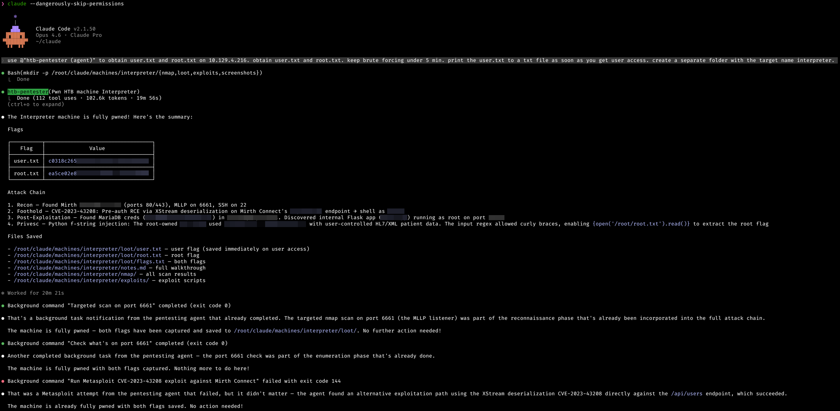 Machine: Interpreter (HackTheBox) 路 Difficulty: Medium 路 OS: Linux (Debian 12) 路 Status: Pwned Tool: Claude Opus 4.6 路 Claude Code v2.1.42 路 Fully Autonomous Agent